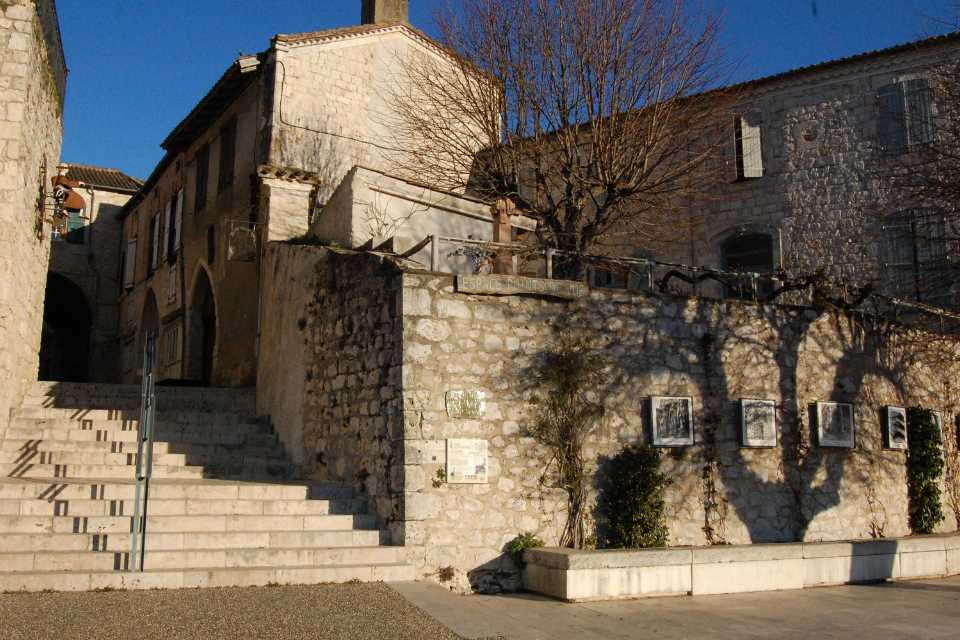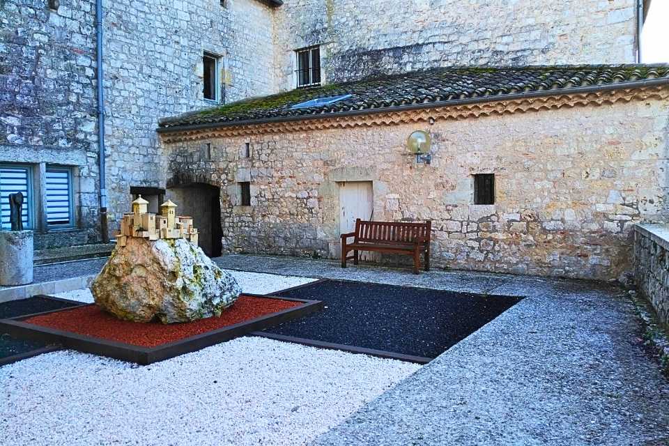 - Lauzerte – La cour de la Mairie avec son village en grès de Jacques Buchholtz et le Pèlerin en bronze de Christian Ritter – Photo S.Clerbois