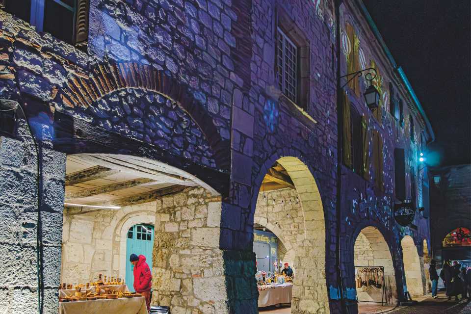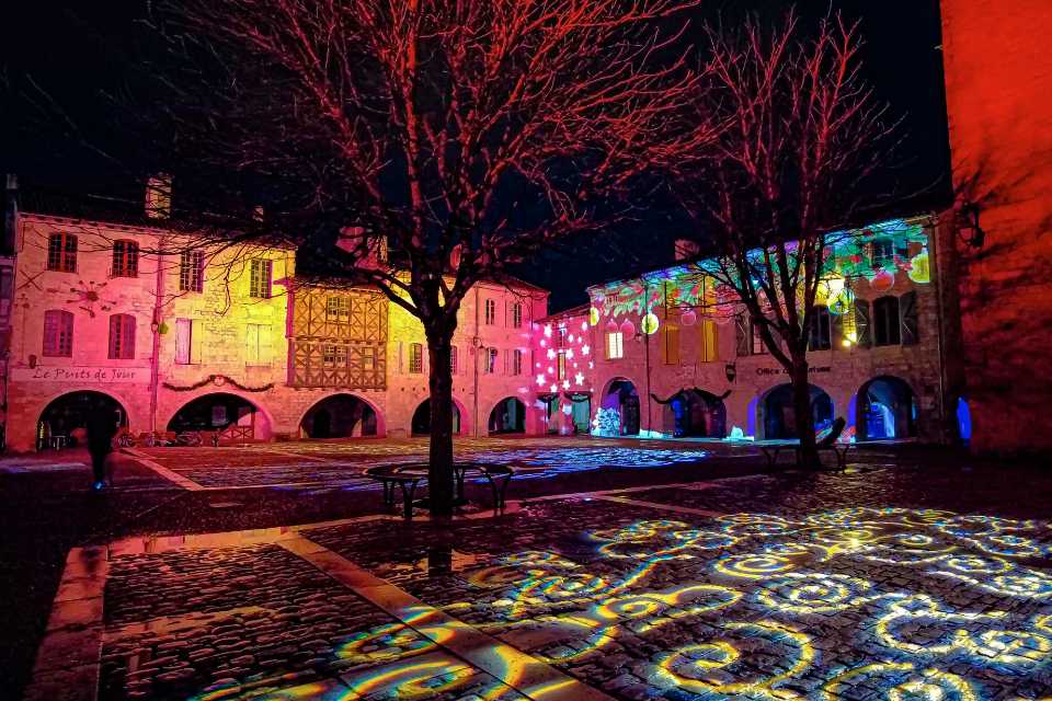 - Lauzerte – L’église Saint Barthélémy et la Halle en décembre pour le marché de Noël – Photo S.Clerbois